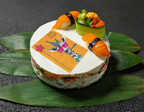 Мини тортик с лососем, огурцом, авокадо, сливочным сыром, крабовым миксом, рисом, нори и фирменным соусом+2 сяке и гункан