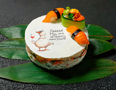 Мини тортик с лососем, огурцом, авокадо, сливочным сыром, крабовым миксом, рисом, нори и фирменным соусом+2 сяке и гункан