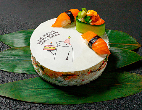 Мини тортик с лососем, огурцом, авокадо, сливочным сыром, крабовым миксом, рисом, нори и фирменным соусом+2 сяке и гункан
