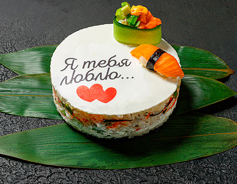 Мини тортик с лососем, огурцом, авокадо, сливочным сыром, крабовым миксом, рисом, нори и фирменным соусом+ сяке и гункан