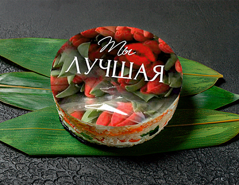 Мини тортик с лососем, огурцом, авокадо, сливочным сыром, крабовым миксом, рисом, нори и фирменным соусом